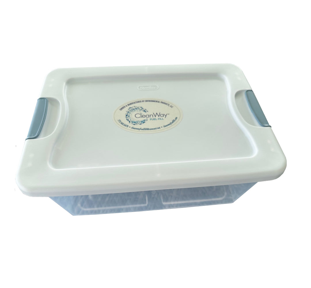 Durable plastic storage bin for the CleanWay 12" with extended fin part for RV's. Safely houses your Clean Way Fuel Fill. Measures 17" x 12" x 7" h. Made in the USA, BPA-free and phthalate-free.